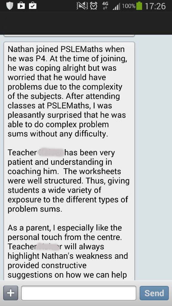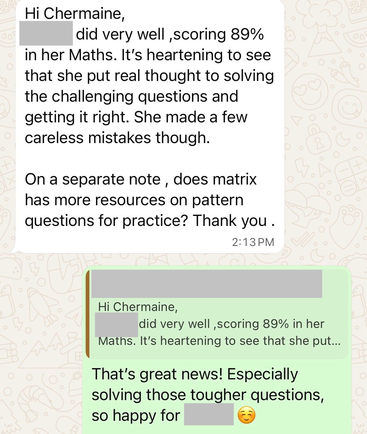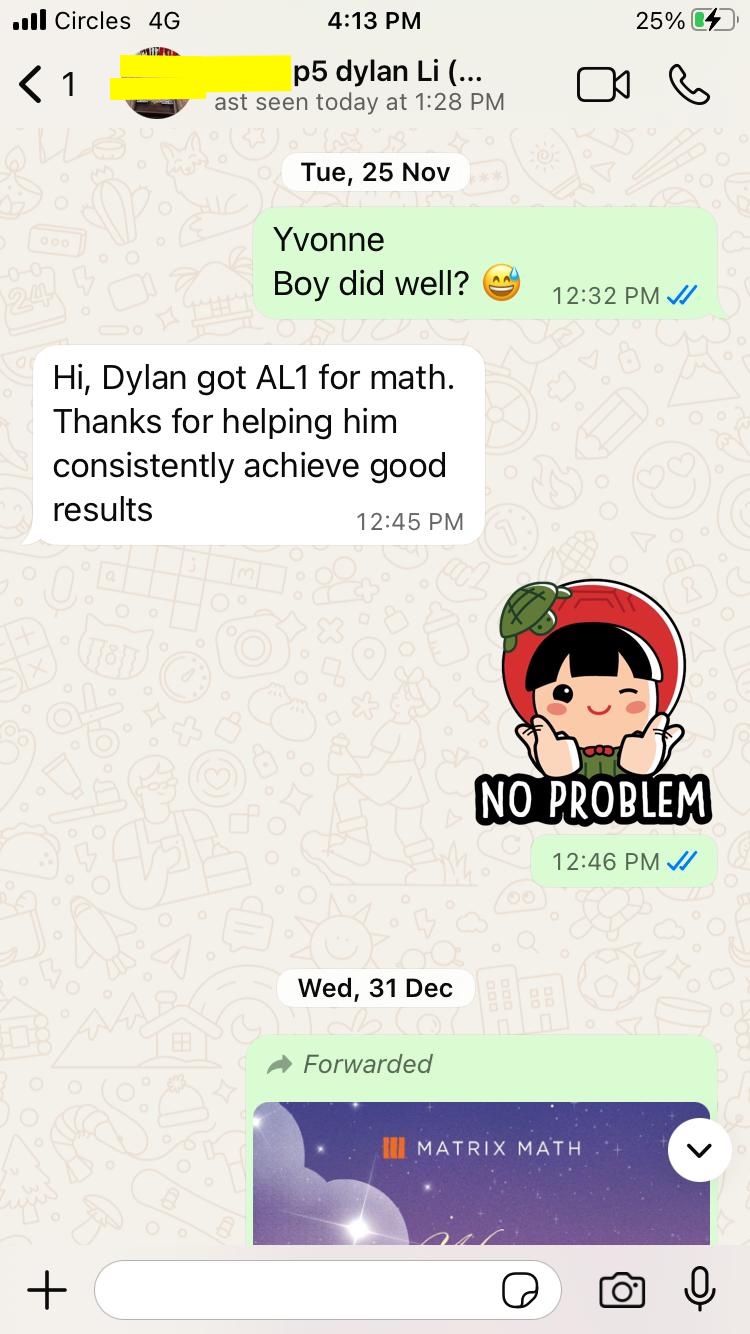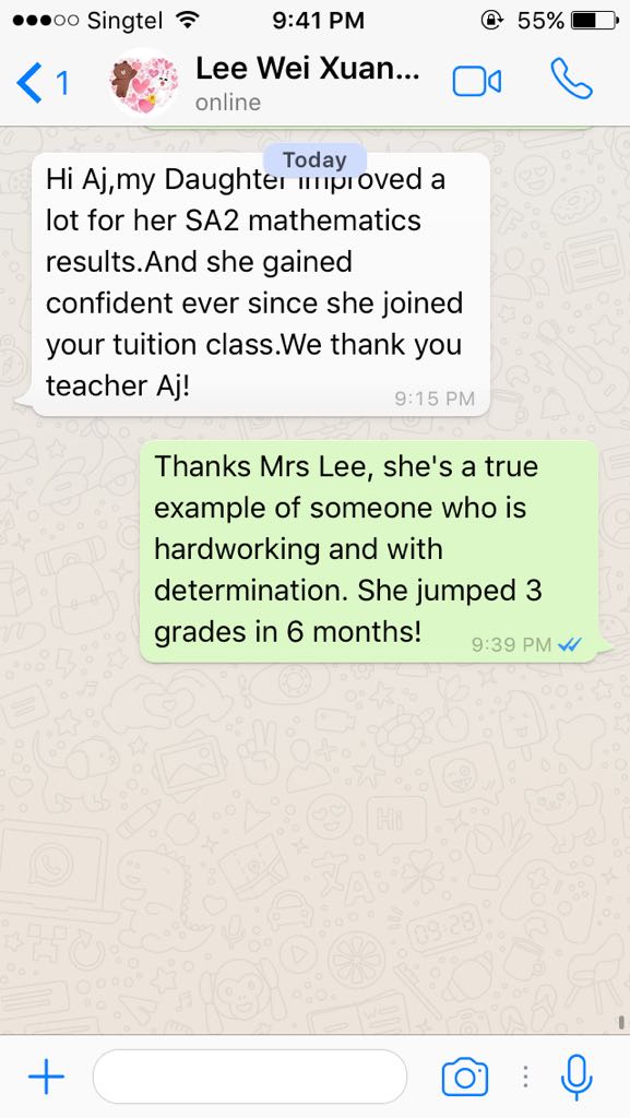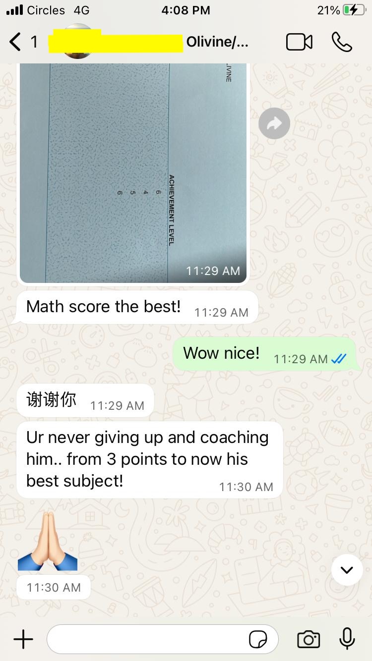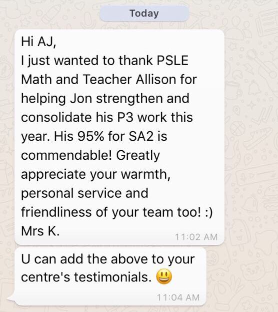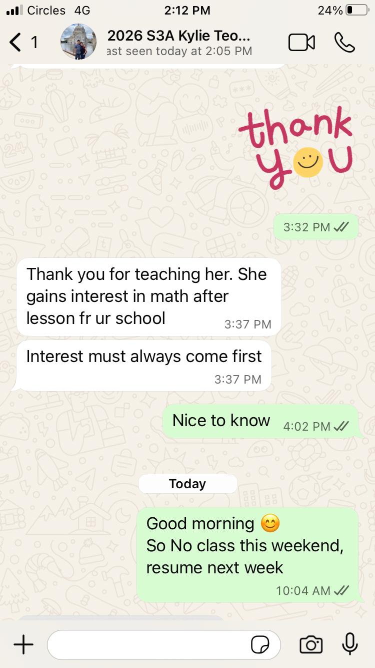 On this page, you’ll find real WhatsApp testimonials from parents whose children have benefited from our small-group math tuition programme. From building strong foundations in primary math tuition, to achieving confidence in PSLE Math, and preparing Secondary 4 students for their O-Level Mathematics examinations, these reviews reflect consistent academic growth and improved problem-solving ability.