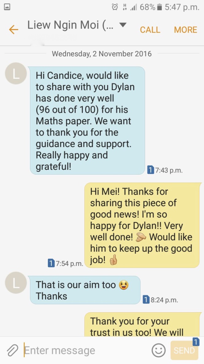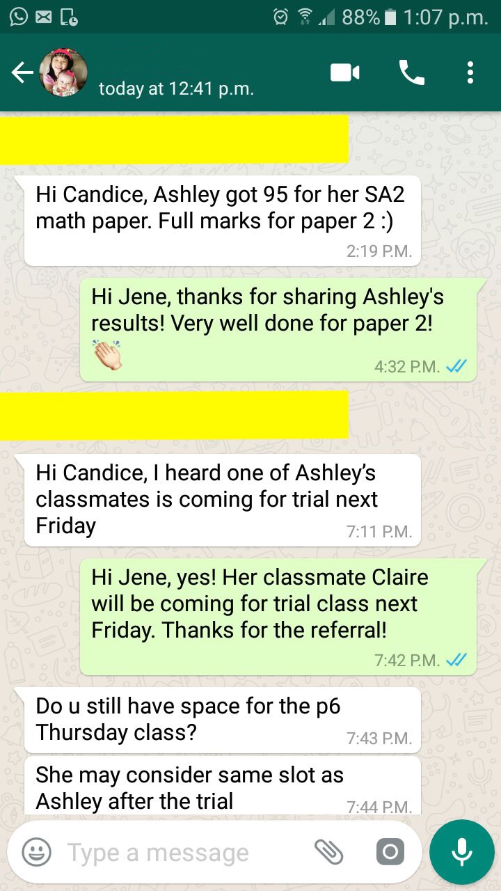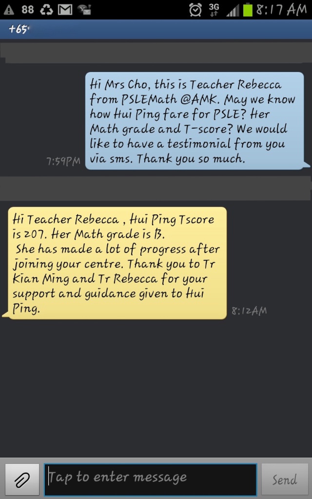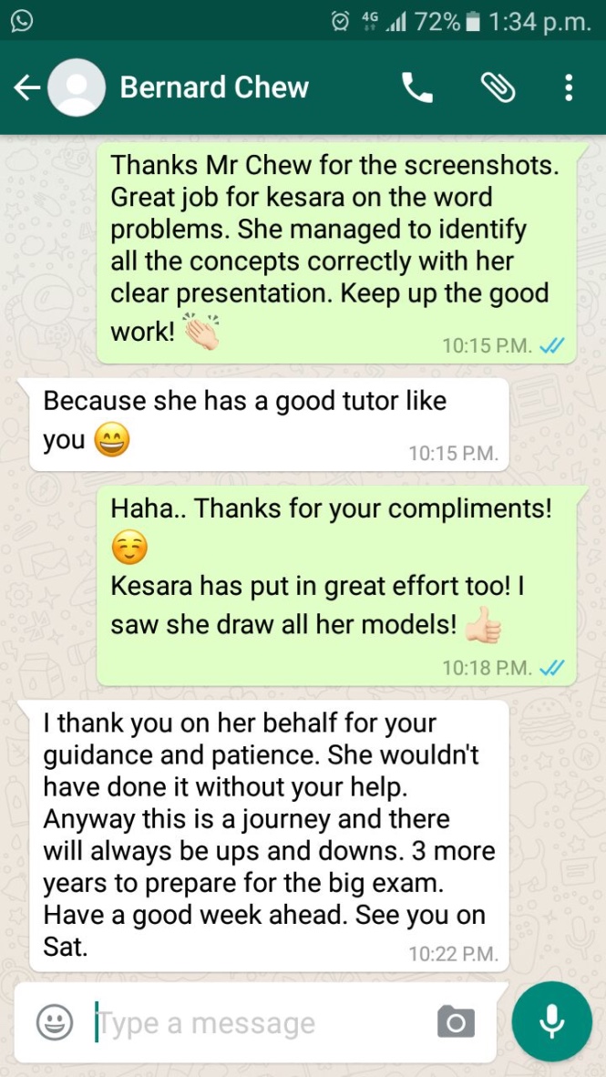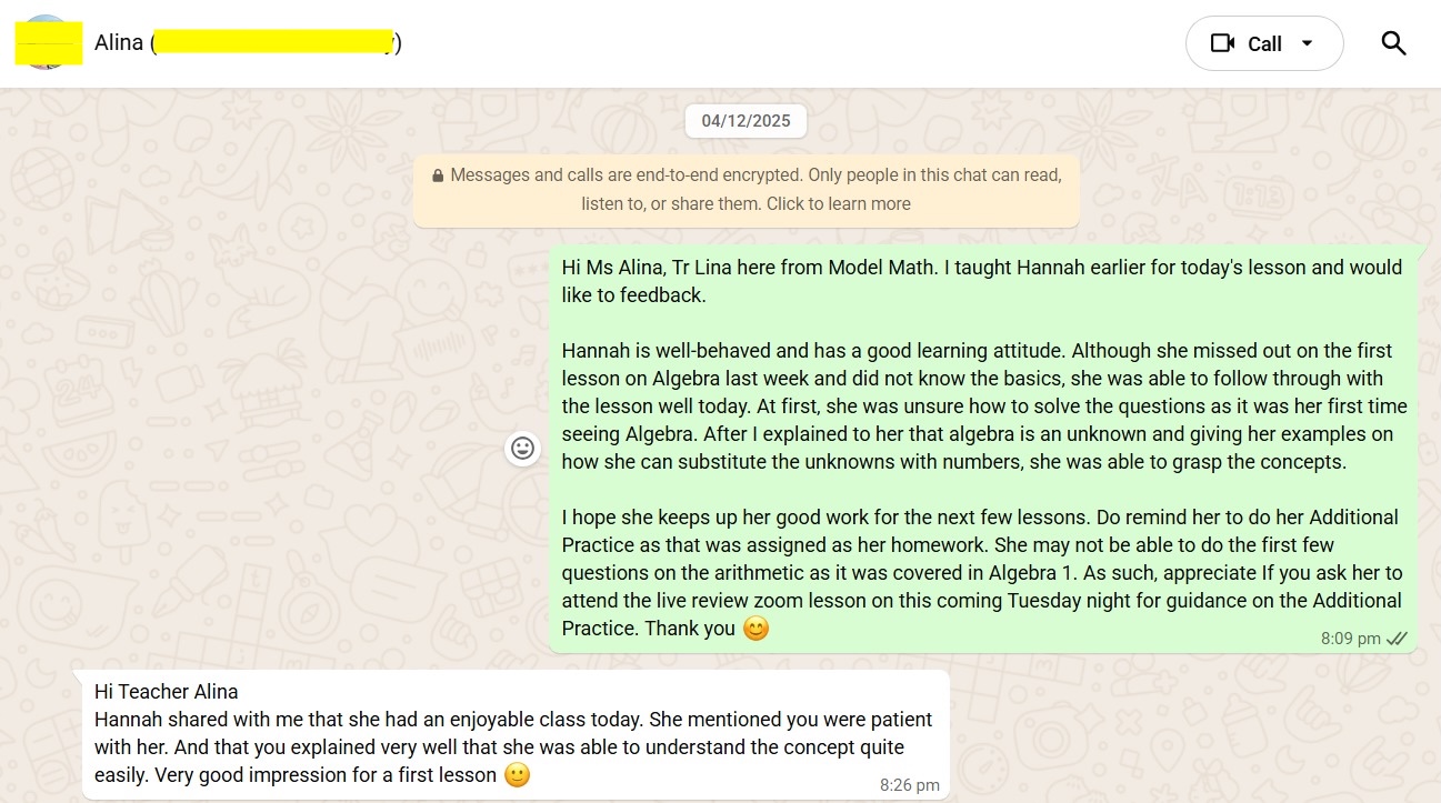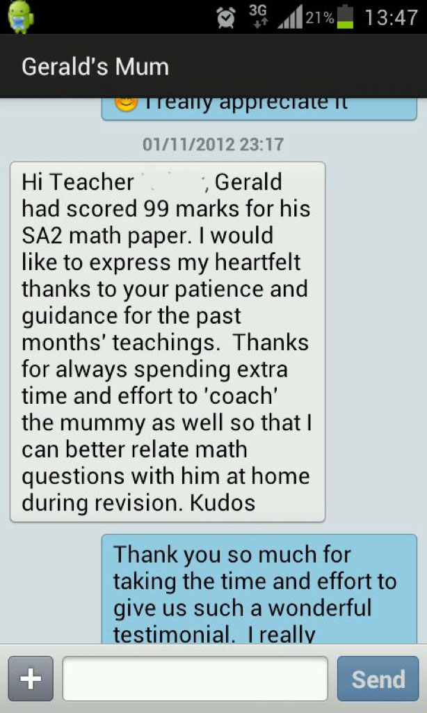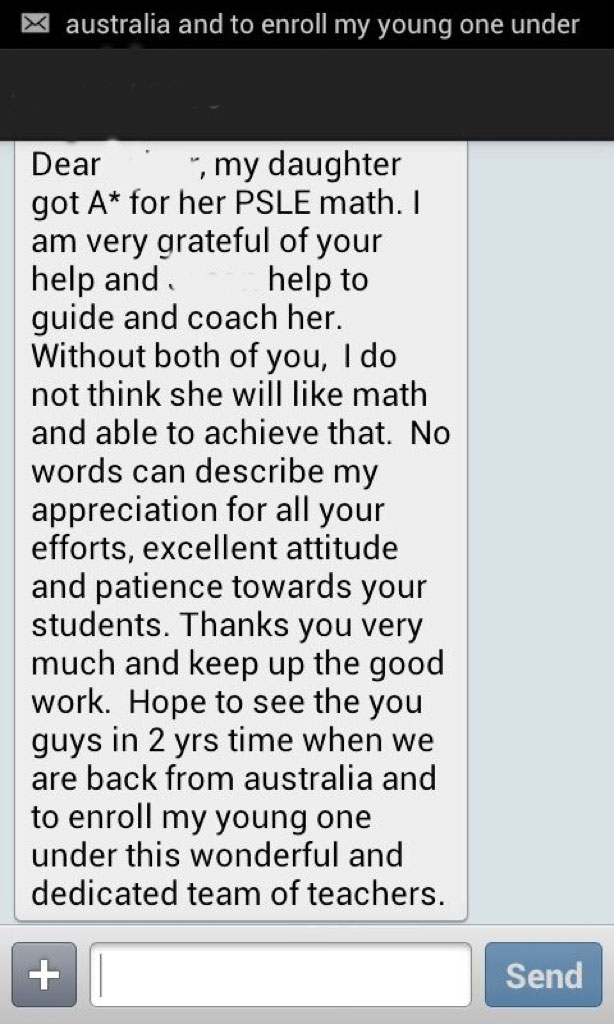 On this page, you’ll find real WhatsApp testimonials from parents whose children have benefited from our small-group math tuition programme. From building strong foundations in primary math tuition, to achieving confidence in PSLE Math, and preparing Secondary 4 students for their O-Level Mathematics examinations, these reviews reflect consistent academic growth and improved problem-solving ability.